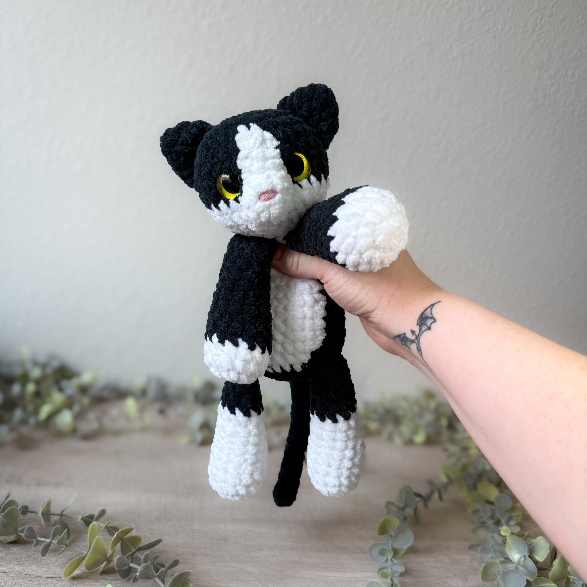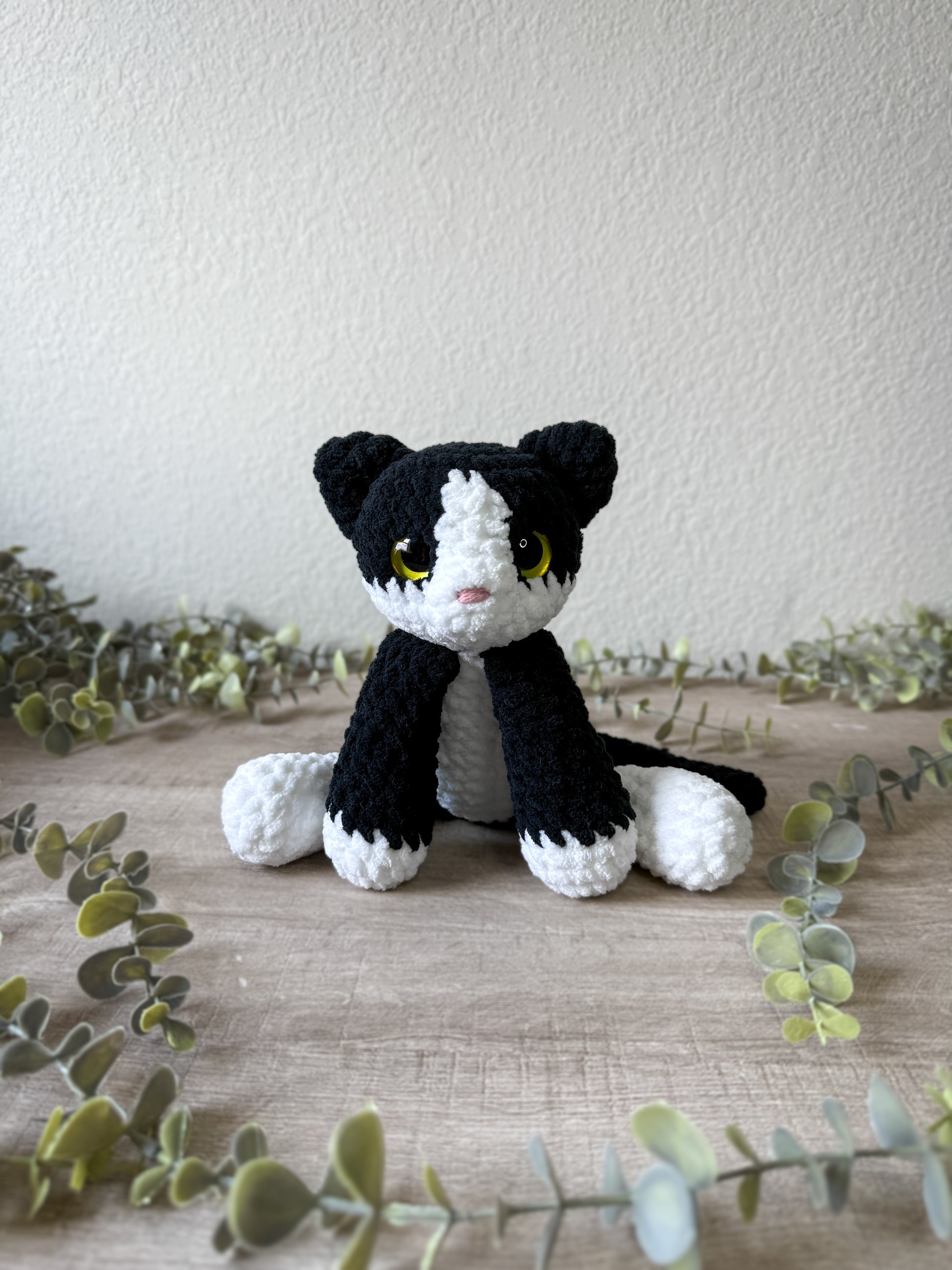 Felix is made with soft, blanket yarn and is about 11 inches long from head to toe.