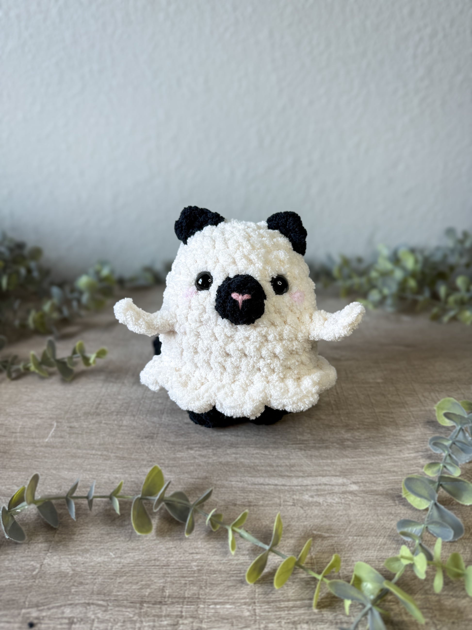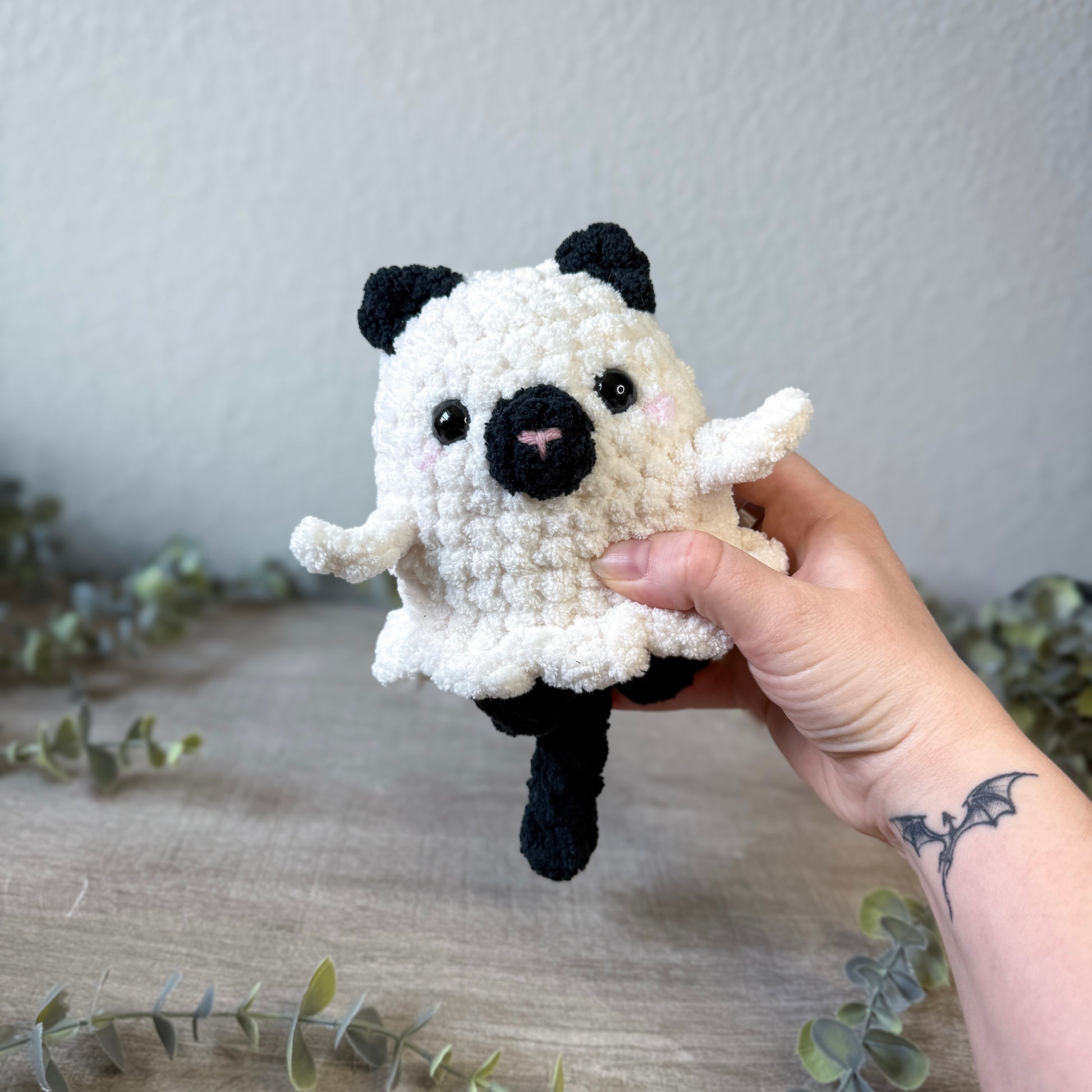 This spooky kitten is made with soft blanket yarn and stands at about 6 inches tall.