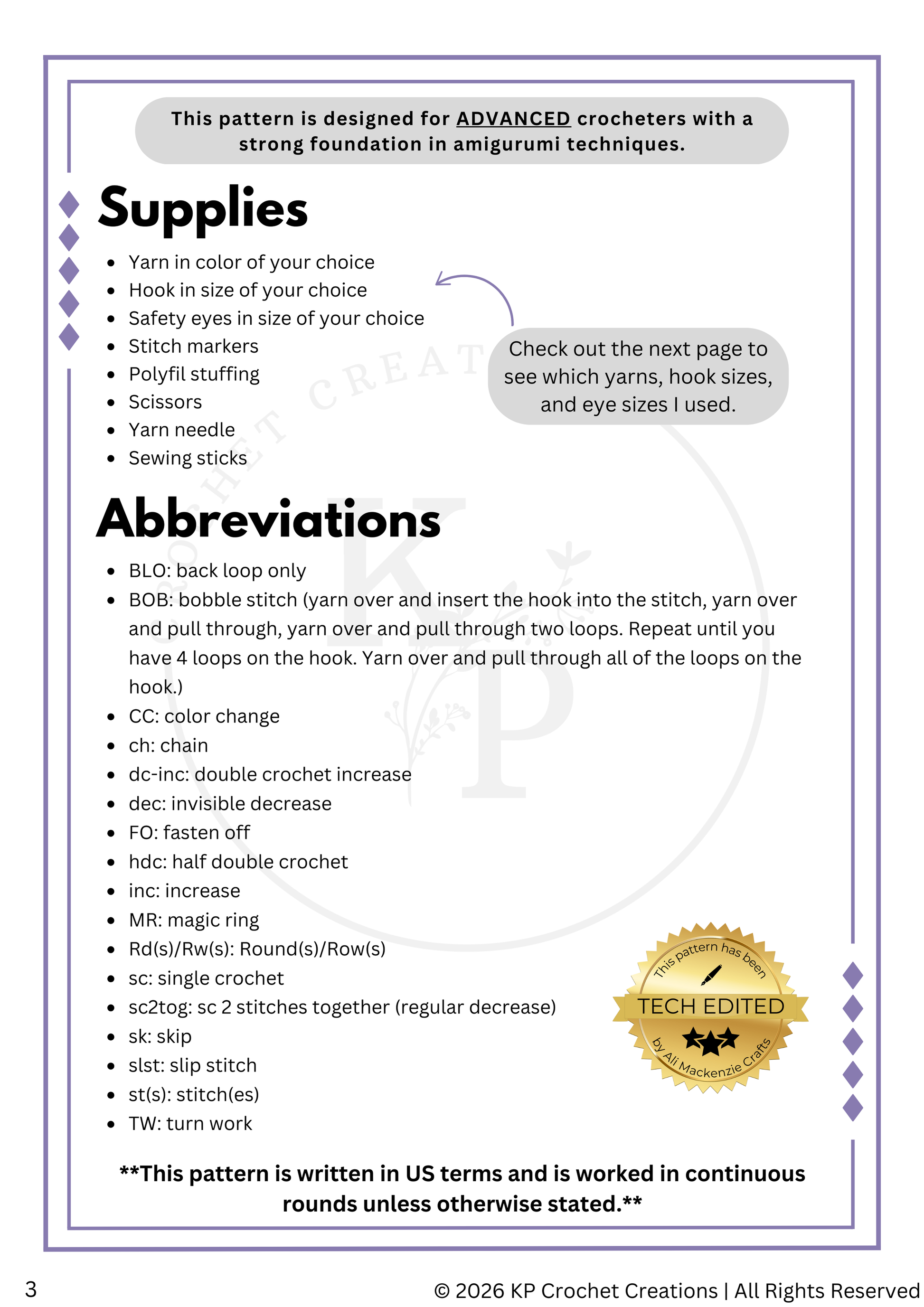 Please keep in mind this is an *ADVANCED* level pattern and is designed for crocheters with a strong foundation in amigurumi techniques. No video tutorials are provided for this pattern.